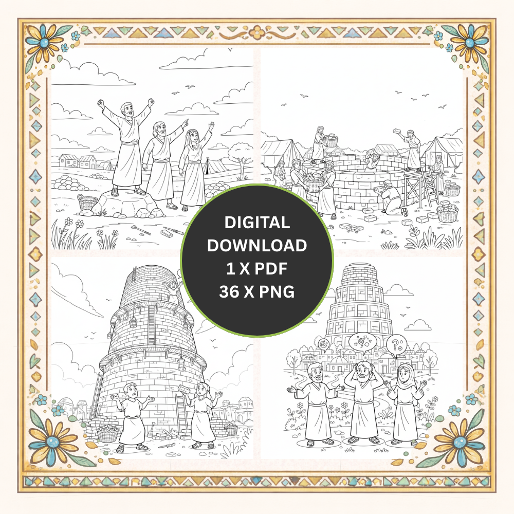 Dieses kreative Malbuch zum Turm zu Babel erzählt Kindern eine der bekanntesten Geschichten der Bibel. Beim Ausmalen entdecken Kinder, wie Menschen gemeinsam einen großen Turm bauen wollten und wie die Sprachen der Welt entstanden.